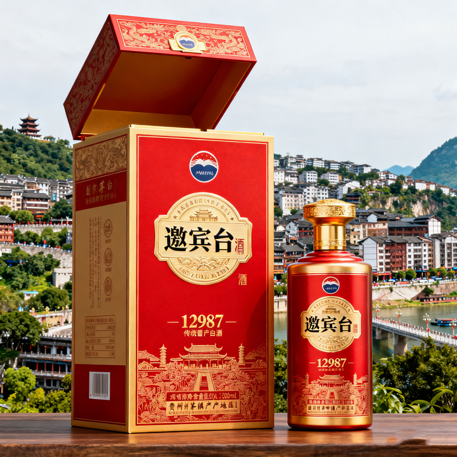 生成一款商標名稱為邀賓臺酒的上開蓋酒盒及酒瓶,以紅色、金色為主基調,含12987工藝及傳統醬香型白酒文化,該酒產自貴州茅臺鎮