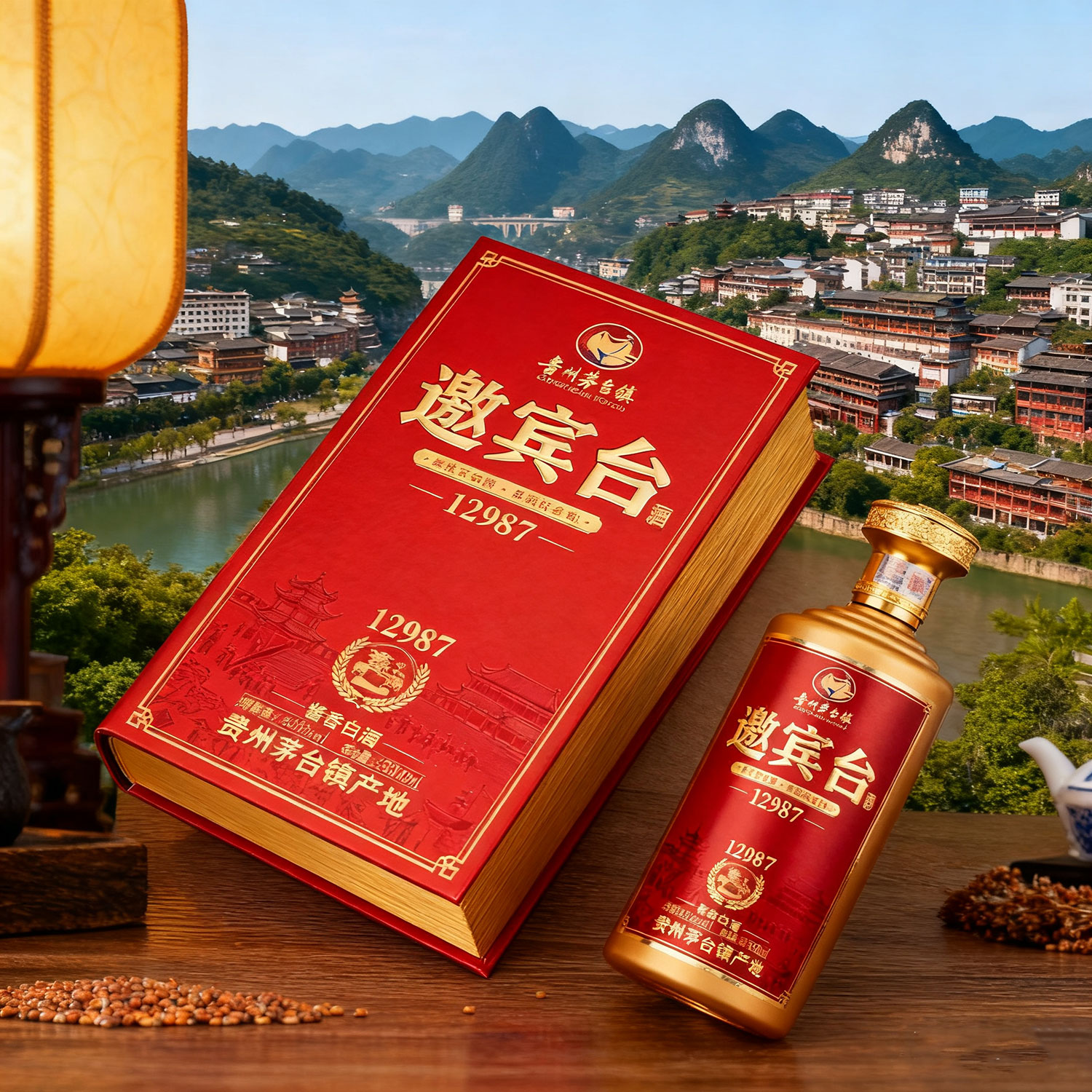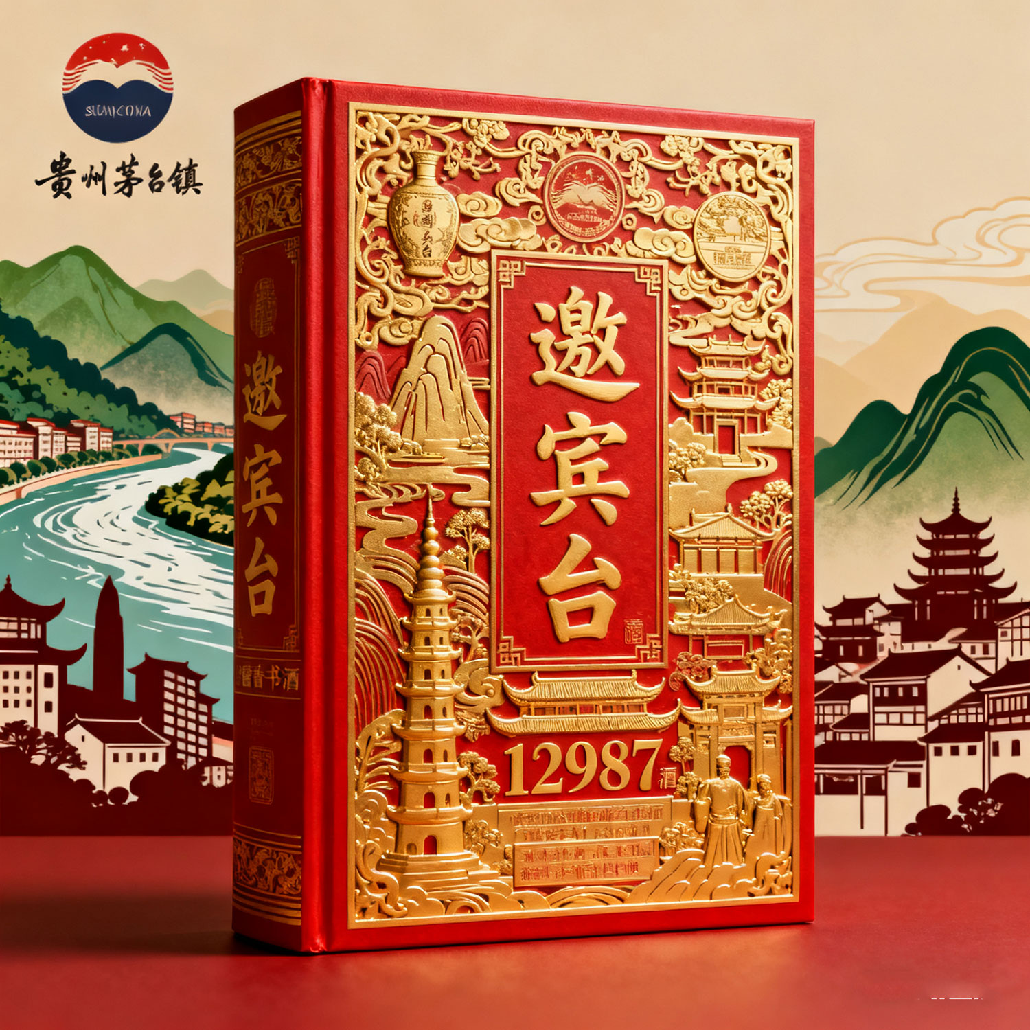 生成一款商標名稱為邀賓臺酒的書型酒盒及酒瓶,以紅色、金色為主基調,含12987工藝及傳統醬香型白酒文化,該酒產自貴州茅臺鎮