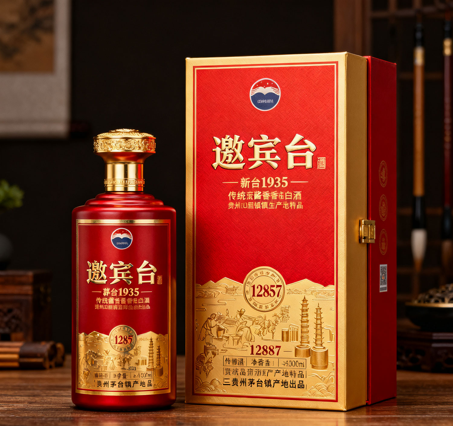 生成一款商標名稱為邀賓臺酒的酒盒及酒瓶,酒盒與茅臺1935新款酒盒類似,以紅色、金色為主基調,含12987工藝及傳統醬香型白酒文化,該酒產自貴州茅臺鎮